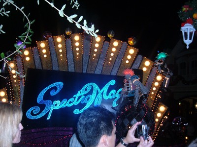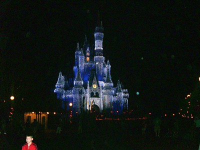 After our tour of the campground we went back out to Magic Kingdom. Because we were staying on property we can take advantage of extra hours in the mornings and evenings. Monday Magic Kingdom had extra hours until midnight so we took the kids out for their first time getting to see the nighttime parade and the fireworks. Unfortunately, my camera doesn’t work very well in the dark so I got one good shot from the parade and one picture of the castle while it was lit up. The lights made the castle look like it was frosted with lights.